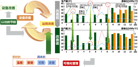 以往的設(shè)備節(jié)能是以「引進節(jié)能設(shè)備?機器?新技術(shù)」即設(shè)備改善為主體,是針對點的改善。三菱電機認(rèn)為「依據(jù)可視化管理具體把握能量消耗的動向,做到庫華制冷適合化」這種通過可視化管理將設(shè)備改善與運用改善綜合鏈接的活動才是持續(xù)節(jié)能的重點所在。如圖所示: